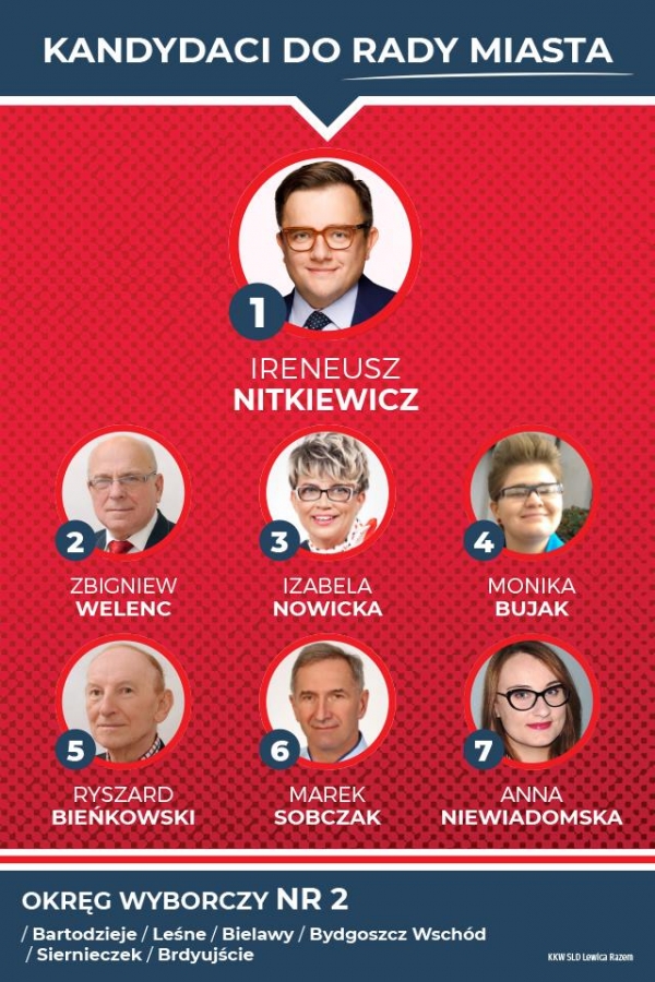Prezentujemy kandydatki i kandydatów startujących w ramach Koalicyjnego Komitetu Wyborczego SLD Lewica Razem do Rady Miasta Bydgoszczy, kandydatkę na urząd prezydenta Bydgoszczy oraz listę do Sejmiku Wojewódzkiego w okręgu nr 1 - Bydgoszcz.