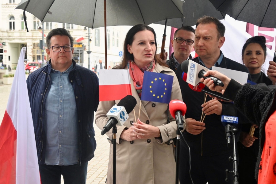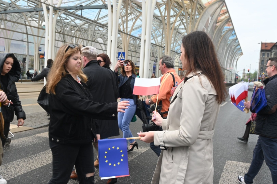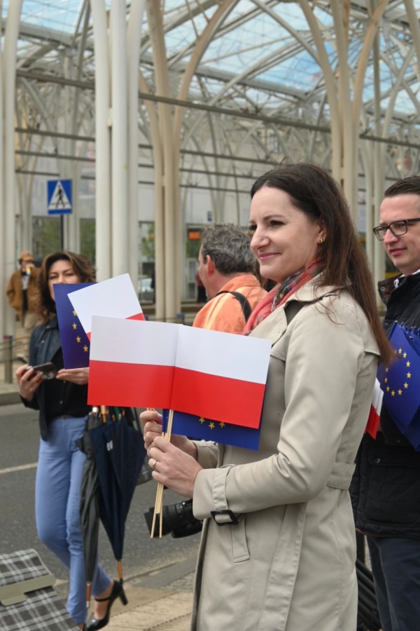 "Dzisiaj również rozdajemy flagę Unii Europejskiej, bo jesteśmy 19 lat w Unii Europejskiej. Pokazujemy wyraźnie, że zarówno tu w Łodzi, jak i w innych samorządach, małych gminach, miasteczkach, dzięki środkom z Unii Europejskiej możemy się rozwijać. To jest przede wszystkim nasze bezpieczeństwo i tak, jak prezydent Andrzej Duda powtarza, że barwy naszej flagi powinny jednoczyć wszystkich, to my dzisiaj przypominamy, że cały czas zablokowane są środki z Unii Europejskiej, cały czas nie możemy otrzymać, jako samorząd łódzki, tych środków, żeby dobrze się rozwijać" — zwróciła uwagę Małgorzata Moskwa-Wodnicka, Wiceprezydent Miasta Łodzi.